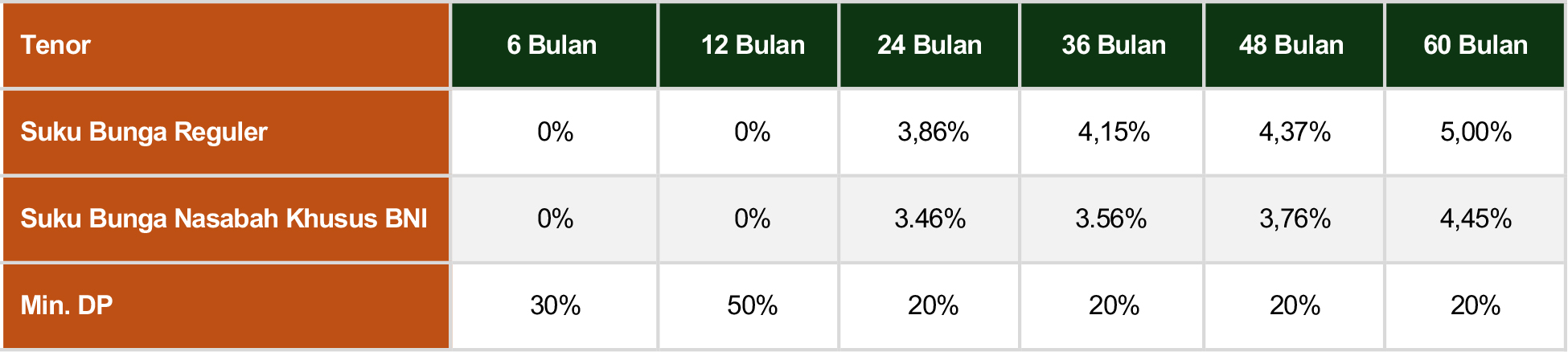 Suku bunga dan minimum uang muka di atas tidak mengikat, serta dapat berubah sewaktu-waktu sesuai dengan kebijakan dan ketentuan yang berlaku.